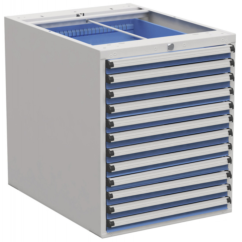Ce bloc est composé de 1 à 8 tiroirs avec fermeture centralisée par clé. La structure en acier est recouverte d’une peinture gris clair RAL 7035. Les tiroirs sont revêtus d’une peinture bleu RAL 5007 ou gris RAL 7035. Le bloc-tiroirs est disponible en hauteur 140, 360 et 660 mm.