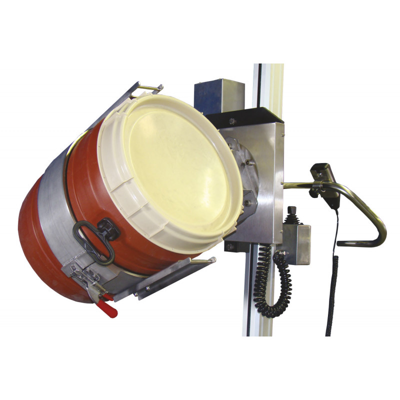 Ce module permet la prise d'un fût avec rotation électrique pour réaliser le vidage. Cet outil se fixe sur le mât du mini gerbeur semi-électrique Lift & Drive.