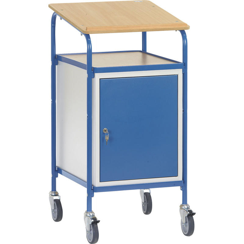 Pupitre roulant avec tablette écritoire inclinée en mélaminé surface effet hêtre avec rebord.